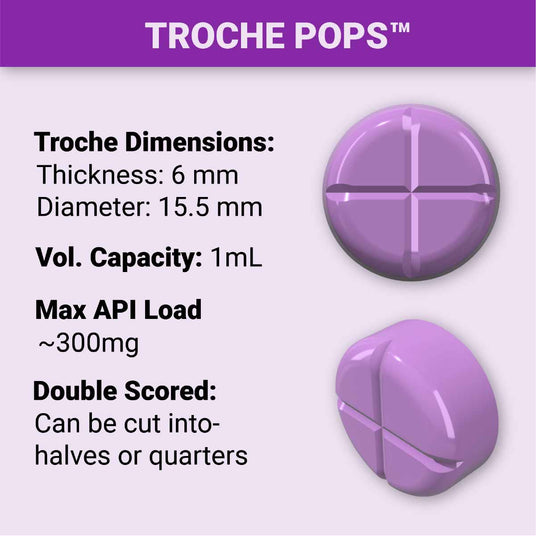 - Custom dispensable TROCHE POPS® Box is available (die-line for customization available upon request)