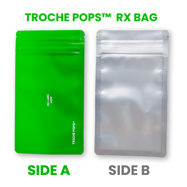 With TROCHE POPS™, the dispensing package must match the product's elegance. Take advantage of the TROCHE POPS™ Rx Bag, designed to hold up to 30 TROCHE POPS™ with a secure zip-lock closure—fully compliant for final dispensing.