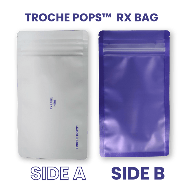With TROCHE POPS™, the dispensing package must match the product's elegance. Take advantage of the TROCHE POPS™ Rx Bag, designed to hold up to 30 TROCHE POPS™ with a secure zip-lock closure—fully compliant for final dispensing.